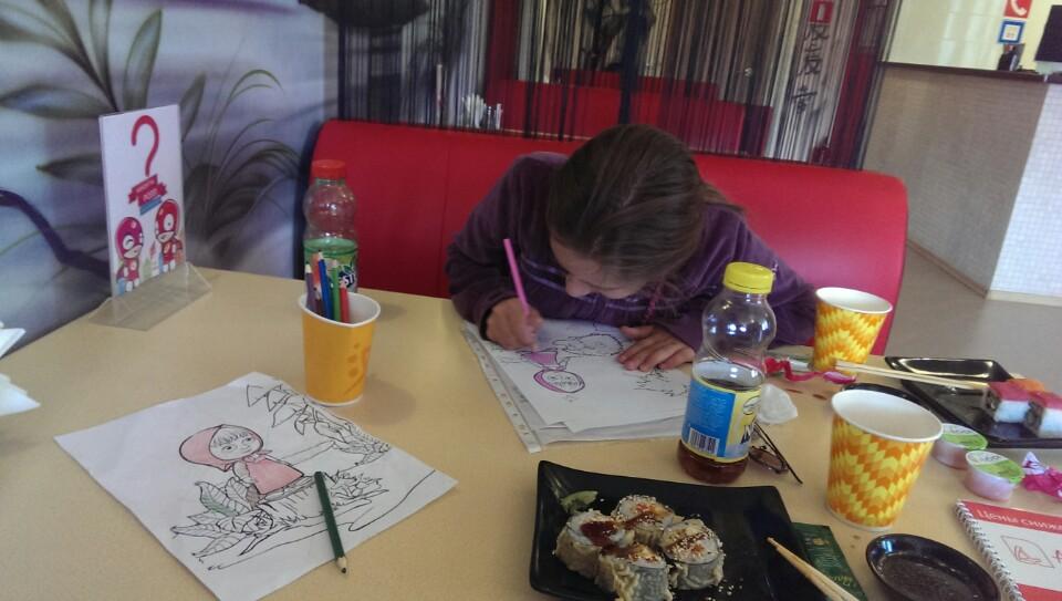 Неплохие роллы. Обслуживание быстрое, но подходить нужно самому.Чаще забирают еду с собой,а зря!Тут есть карандаши и раскраски!) В целом, ничего особенного. Идеальный вариант для тех, кто живет рядом.